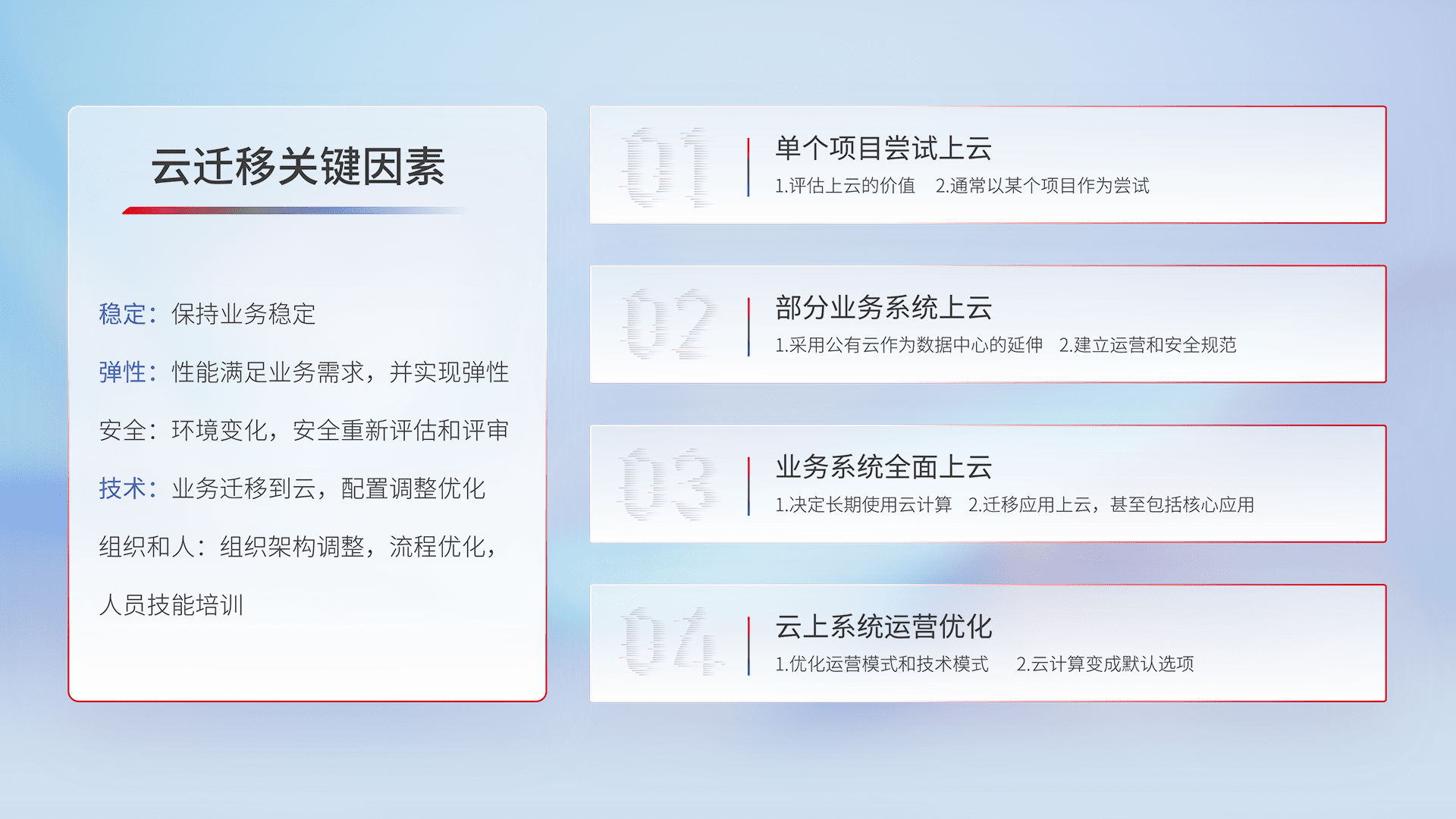 结合实际业务,,从规划设计、、云平台选型、、云原生改造、、、、数据迁移、、、集成交付,,,迁移全过程为客户识别最佳上云路径,,,,做好风险识别管理,,,,设计网络架构、、、、身份权限、、、安全审计合规、、操作审计、、、日志审计、、、、监控告警策略、、、、多站点容灾设计等,,,对云上基础设施进行整体规划,,,提升IT治理水平,,,,以满足弹性、、、高可用、、高性能的需求。。。。