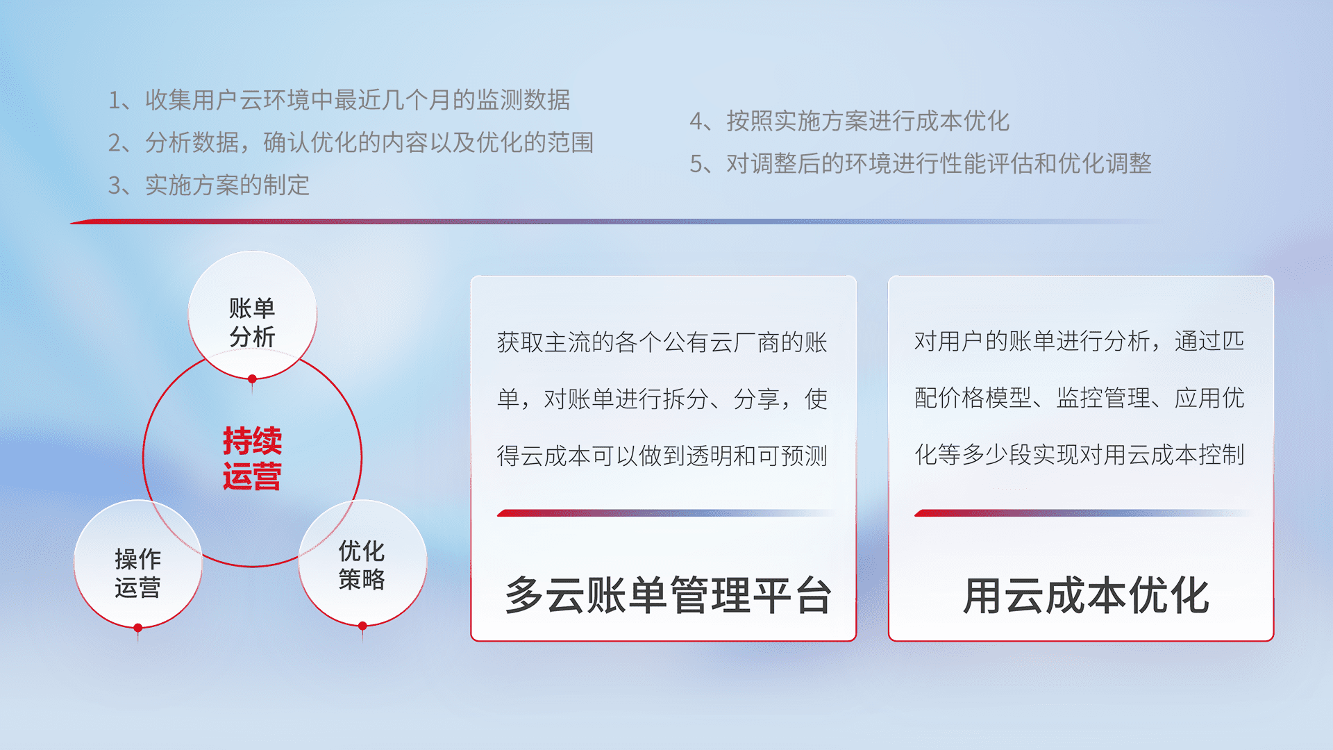通过多云纳管,,,,以统一的资源数据模型把客户的云资源进行抽象和封装,,,进而实现对多云资源的统一操作,,,保障云资源管理的可靠性、、、稳定性与可用性。。。量身定制化运维内容,,,配置、、开发运维、、补丁管理、、备份、、监控、、、、认证和访问管理、、审计和日常巡检等,,,,保障在用云过程中的可靠度,,,,稳定度以及高可用率。。。。
