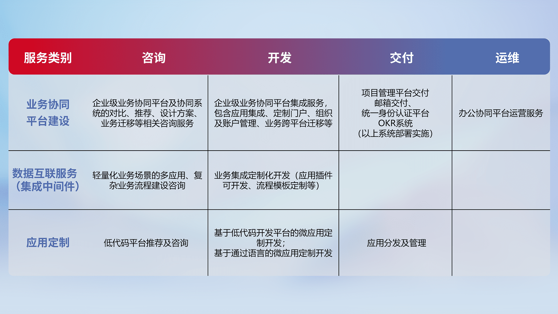 针对钉钉、、、企微、、IDaas等平台级产品提供产品的规划、、、方案、、交付、、、、定制化开发等服务,,实现如统一协同办公、、、智能客户服务、、、、混合会议管理、、、智能数据查询、、、等业务场景,,,,实现数字化转型。。